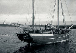 The story begins with Connor O’Brien (1880-1952) whose ketch, the Saoirse, took him on a circumnavigation of the world between 1923 and 1925, becoming the first Irishman to achieve this feat. On this journey he stopped off at Port Stanley in the Falkland Islands. The islanders were so impressed at the way the Saoirse rode the waves that they asked O’Brien to have built a similar boat.The Ilen, named after the river and estuary whose mouth is at Baltimore, was built in the same boatyard by the same builders to the same type as the Saoirse and registered at the port of Skibbereen in February 1926. She was 56 feet in length overall with a beam of 14 feet and a displacement of 45 tonnes.Connor set sail in August 1926 with two Cadogan cousins from Cape Clear, arriving at Port Stanley in January 1927 and handed it over to the new owners, The Falkland Islands Company, in exchange for £1,500. There she remained ploughing between the islands with a cargo of stores, mail and sheep as well as ferrying passengers. She stayed in service until the early 1990’s.